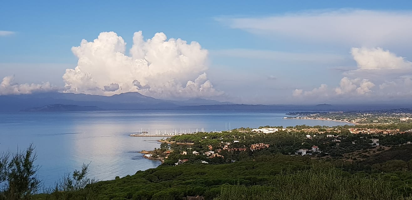 From a modern tourist port, a thin white strip extends to the east of the Golfo degli Angeli, a stone’s throw from Cagliari, and fades away between rocks overlooking the blue sea
