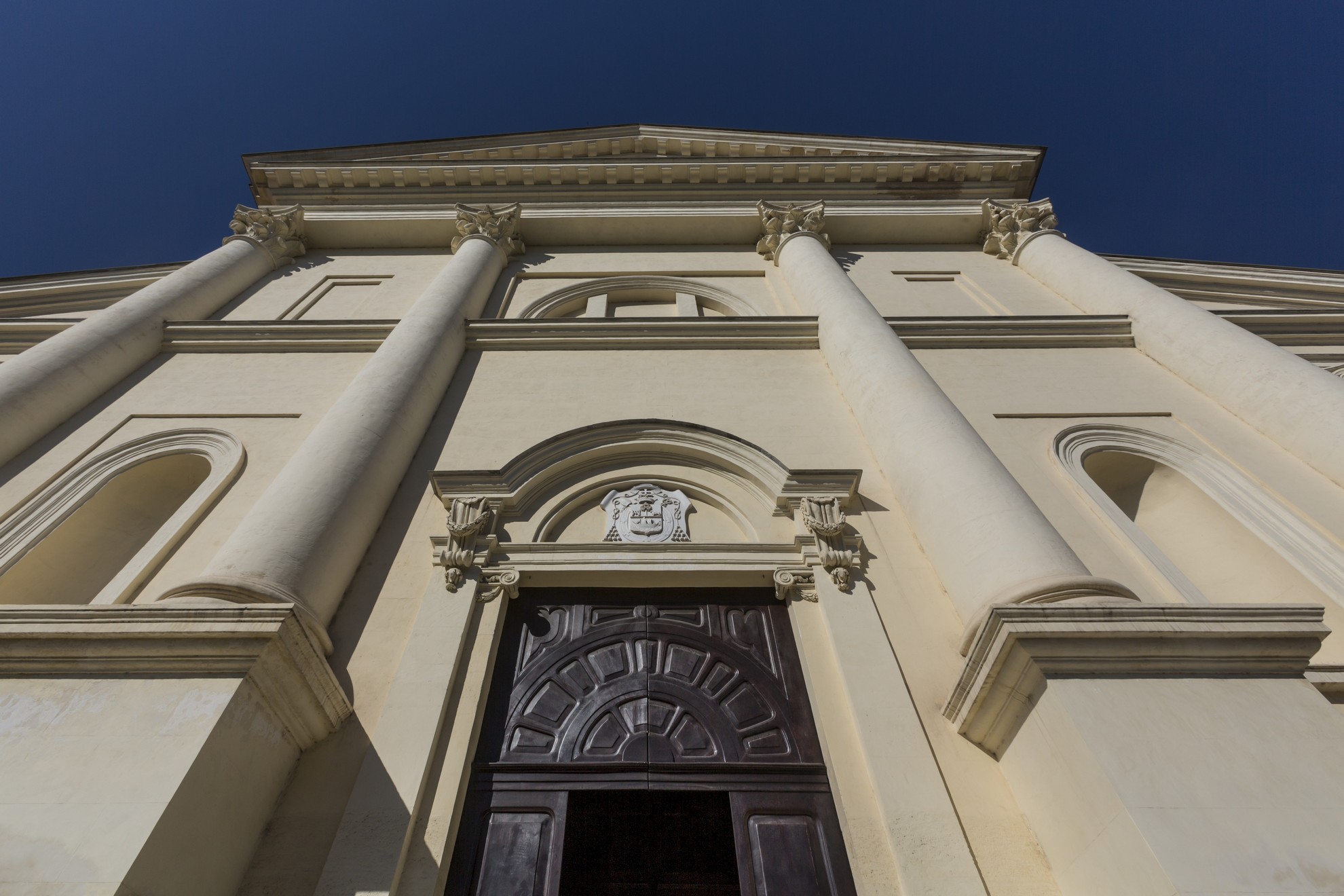 门面具有中心按列科林斯搁在高骰子四巨头顺序穿插,而在侧面上有两个圆拱形龛,它们是横向机构的相同形状和尺寸的两个窗口。在中间打开窗口中心和两个半圆和矩形窗口。走廊由一系列的墙视窗标记,而大殿中心由扶壁隔断成拱形。