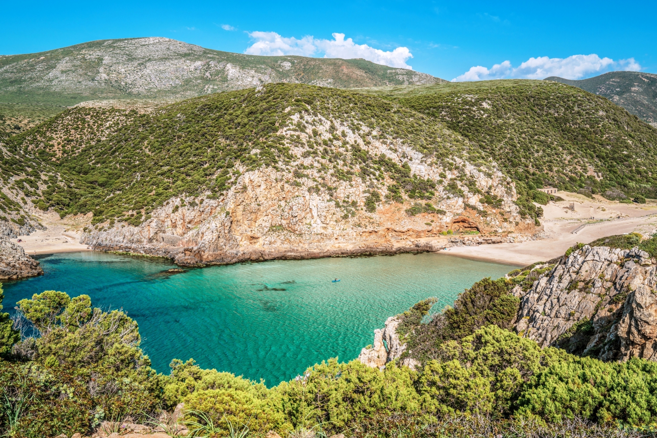 La cala maggiore è una profonda e deliziosa insenatura, quasi un fiordo, con un’ampia e riparata spiaggia di sabbia dai colori tra il bianco, l’ambrato e il dorato, soffice e compatta. Piccoli arbusti di macchia mediterranea spuntano sulle dune alle spalle della distesa di sabbia. Davanti, si affaccia un mare tra i più belli della Sardegna, dai colori turchese e azzurro.