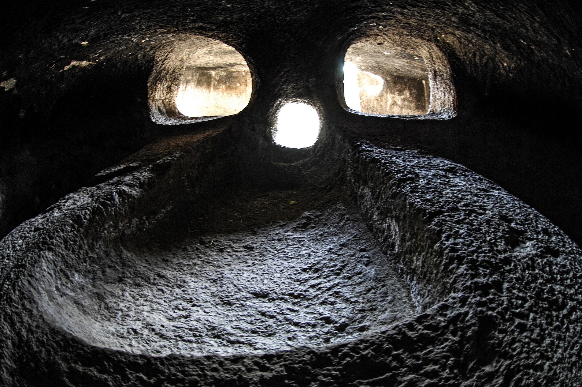 La necropoli faceva capo a un villaggio del III millennio a.C., di cui vedrai i resti sull’altura di s’Arriorxu. Tante altre perdas fittas (conficcate) caratterizzano il territorio, dove trova posto un’altra necropoli neolitica, le domus di Marchianna, e i ruderi di altri 40 nuraghi. Dall’ingresso dell’area archeologica salirai lungo un sentiero per alcune centinaia di metri. La maggior parte delle domus de Janas di Montessu sono pluricellulari, formate da vestibolo e camera maggiore con più nicchie o da più camere disposte in successione longitudinale, accessibili attraverso corridoi e in alcuni casi impreziosite da colonne sbozzate e incisioni parietali. Portelli di pietra incassati chiudevano gli ingressi, che in qualche caso ricordano un teschio: scelta non casuale. Cavità, nicchiette e coppelle fungevano da posa per corredo e resti del defunto. Le sepolture più semplici hanno una camera di un metro di diametro con volta bassa: dall’angusta porticina si introduceva il cadavere in posizione fetale. Per maestosità ed elaborata architettura si distinguono due tombe-santuario all’estremità dell’anfiteatro naturale, una fronte all’altra: sa Cresiedda (chiesetta), la più fotografata, e sa Grutta de is procus (grotta dei porci), caratterizzate, sul fronte, da allineamenti megalitici disposti a semicerchio, ingressi monumentali alti circa due metri e da un ampio padiglione che fungeva da vestibolo. Attraverso tre aperture accederai alla camera mortuaria, ripartita da robusti divisori nei quali si aprono portelli disposti in uno schema a spirale simboleggiante gli occhi. Sul lato esterno ad esse, si affiancano altre due domus significative sotto l’aspetto della simbologia religiosa. Prendono nome dai motivi decorativi, incisi o in rilievo, che le caratterizzano: la ‘tomba delle spirali’, decorata nell’anticella con denti di lupo in ocra rossa, colore della rigenerazione, all’ingresso da una protome taurina e, nelle celle, da festoni, motivi a candelabro, falsa porta, che indica il passaggio per l’aldilà, e numerose spirali simboleggianti occhi o seni della dea Madre; mentre, nella volta e all’ingresso della ‘tomba delle corna’, a sviluppo verticale con pozzetto d’accesso, sono scolpite corna di varia foggia, alludenti al dio Toro, analoghe a quelle della Britannia megalitica. La posizione delle due coppie di tombe agli estremi del semicerchio roccioso denota uno schema prestabilito: le tombe monumentali erano poste a protezione delle altre sepolture e del sonno dei defunti.