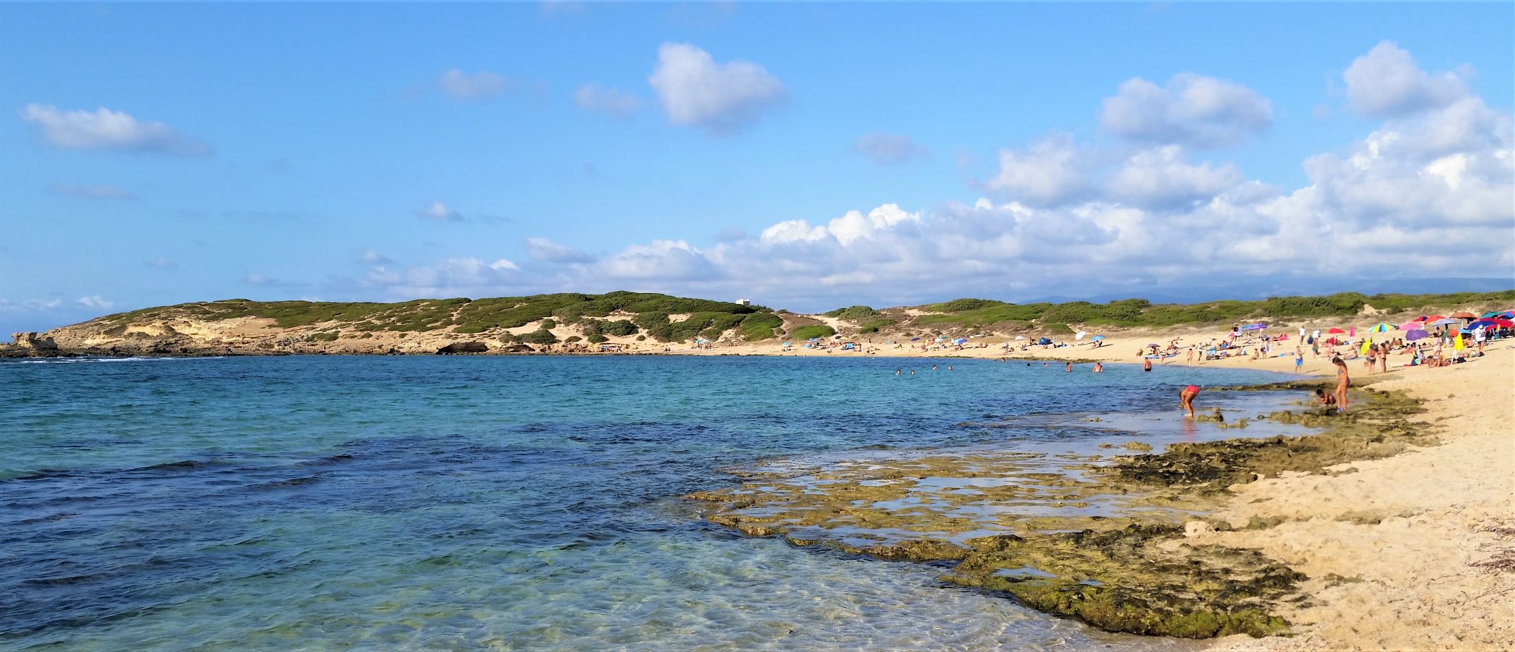 Al centro della baia, e dell’enorme piscina naturale, c’è un piccolo promontorio che divide l’arenile in due parti, di fronte il caratteristico isolotto di forma circolare, ricoperto di vegetazione, alle spalle dune, mentre sul lato meridionale, si ammirerai le scogliere di Capo Mannu. La particolarità è proprio il ‘muro’ naturale, a pochi metri dalla riva, che potrai raggiungere a nuoto o, quando c’è bassa marea, a piedi su scogli piatti percorribili: sali sulla roccia che affiora dal mare e ti sembrerà di camminare sull’acqua. Non a caso, sa Mesa Longa, caratterizzata da acque calmissime, è chiamata anche la Laguna, una laguna suggestive e selvaggia, molto amata dai surfisti. Sull’arenile sono presenti un ampio parcheggio, accessibile anche ai camper, e un punto di ristoro.