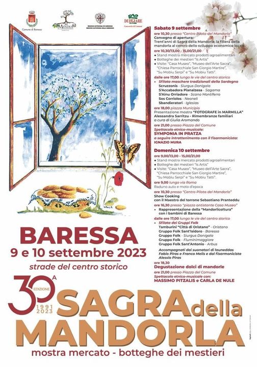 Sabato 9 e domenica 10 settembre a Baressa, paese dell’Alta Marmilla si svolge la manifestazione dedicata al frutto, materia prima per eccellenza dei dolci sardi, e organizzata da Comune e Pro loco “Sa Mendua”, diretta dalla presidente Valeria Scintu, con il sostegno del Consorzio turistico Due Giare. Tagliando il traguardo della trentesima edizione, l'evento prevede due giorni di degustazioni, animazione, laboratori, mostra mercato, tradizioni, folclore e musica. La trentesima sagra della mandorla inizierà sabato 9 settembre alle 10:30 proprio con il convegno ospitato nel centro pilota del mandorlo dal tema “Trent’anni di sagra della mandorla: la filiera della mandorla al centro dello sviluppo economico locale”. Sempre sabato 9 dalle 10 alle 13 e dalle 15 alle 21 e domenica 10 dalle 9 alle 13 e dalle 15 alle 21 mostra mercato di prodotti agroalimentari, botteghe dei mestieri, visite a casa museo, museo di arte sacra, chiesa parrocchiale e vecchi frantoi. Domenica 10 settembre alle 9 raduno di auto e moto d’epoca lungo la via Roma, alle 10:30 nel centro pilota del mandorlo Show Cooking con il maestro del torrone di Tuili Sebastiano Pranteddu, alle 16:30 nella piazza davanti alla casa museo rappresentazione della mandorlicoltura con i bambini di Baressa, alle 17 sfilata di gruppi folk con i Tamburini di Oristano e i gruppi “Sant’Isidoro” di Baressa, “Sant’Antonio” di Arbus, di Siurgus Donigala e Fluminimaggiore, accompagnati dai suonatori di launeddas Fabio Piras e Franco Melis e dalla fisarmonica di Alessio Piras. Alle 18:30 degustazione dei dolci di mandorla e alle 21 nella piazza del Carmine spettacolo etnico-musicale con Massimo Pitzalis e Carla Denule.