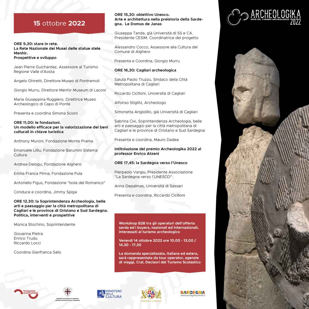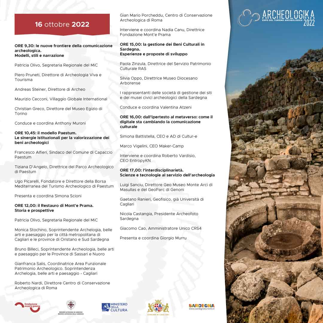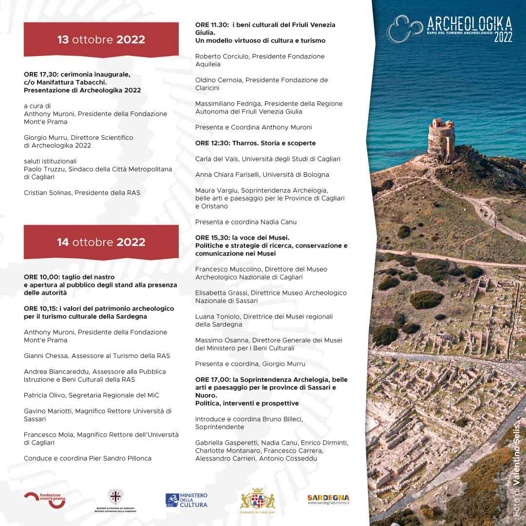 Primo appuntamento di Archeologika 2022 giovedì 13 ottobre, alle 17.30, alla Manifattura Tabacchi a cura di Anthony Muroni presidente della Fondazione Mont’e Prama e Giorgio Murru direttore scientifico, ospiti per il saluti istituzionali Paolo Truzzu, sindaco della Città Metropolitana di Cagliari, e Cristian Solinas, presidente della Regione Sardegna.