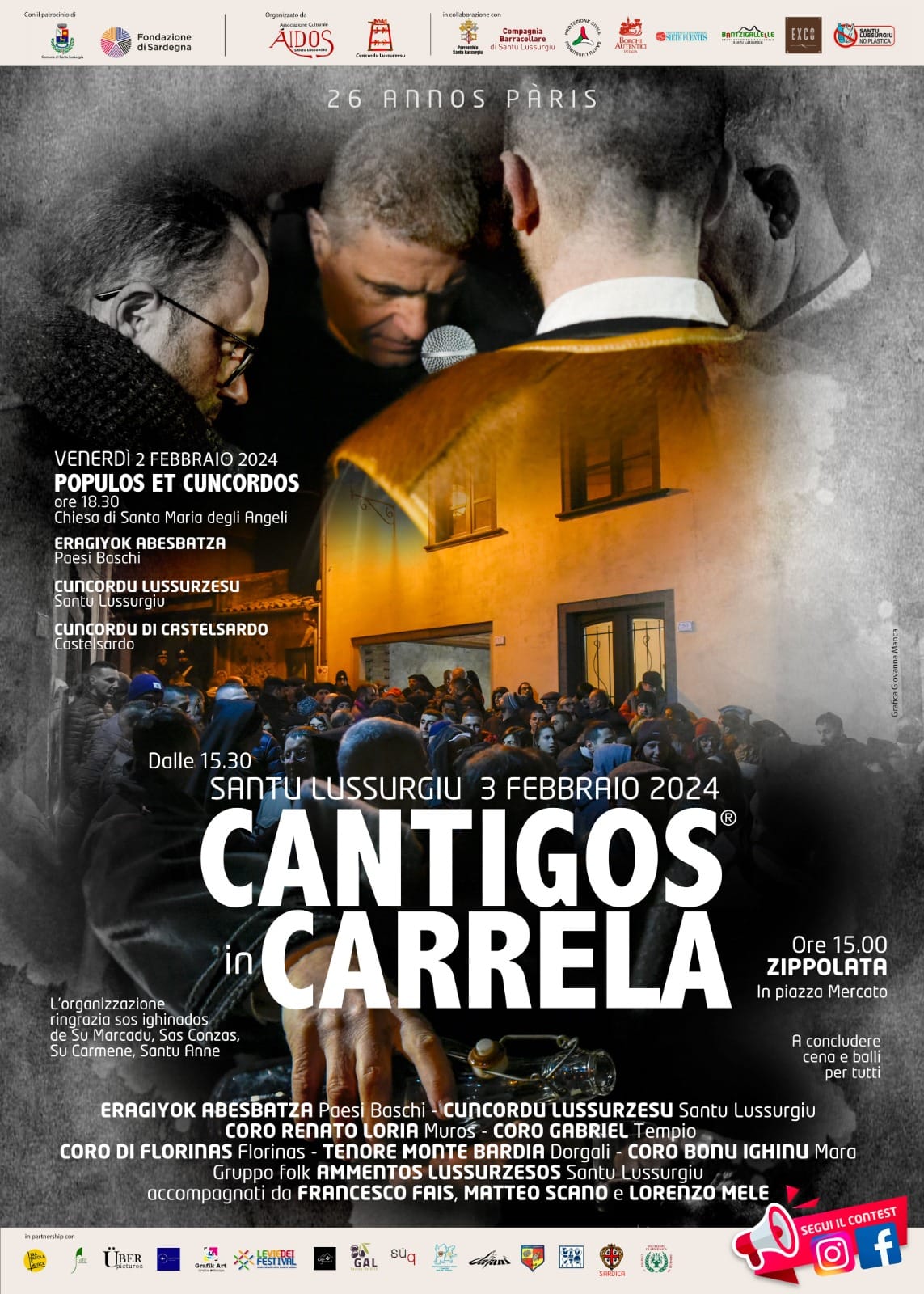 Venerdì 2 e sabato 3 febbraio torna a Santu Lussurgiu l'atteso appuntamento con Cantigos in Carrela, giunto nel 2024 alla 26^ edizione.
