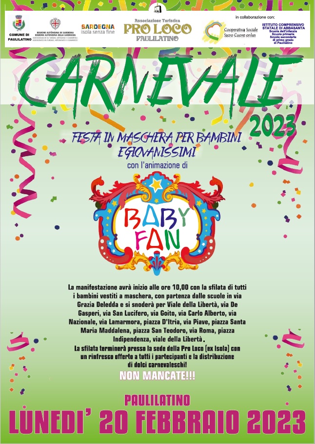 Il 20 febbraio 2023, lunedì grasso, con inizio alle ore 10,00, si terrà a Paulilatino, la XVª edizione della manifestazione “ Carnevale 2023, Festa in Maschera per Bambini e Giovanissimi “.