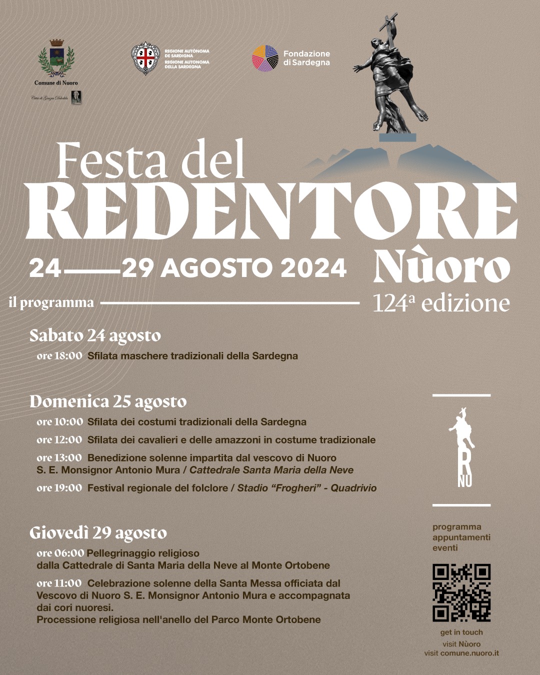 Le celebrazioni del Redentore culminano giovedì 29 con l'emozionante pellegrinaggio religioso dalla Cattedrale di Santa Maria della Neve verso la statua posta a protezione di Nuoro e della Sardegna sul Monte Ortobene, accompagnato dai canti dei cori nuoresi e dalle antiche e tradizionali musiche che seguono i balli e i canti della tradizione sarda.