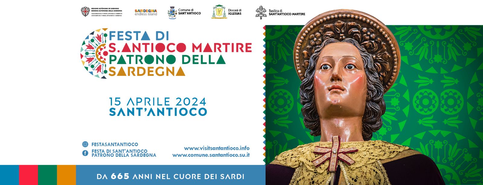 Da venerdì 12 a lunedì 15 aprile 2024, Sant'Antioco torna a festeggiare il patrono della Sardegna, con la 665^ edizione della festa di Sant'Antioco martire. La più antica sagra religiosa dell'Isola vede ripetersi i propri riti immutati da oltre quattro secoli, con la giornata clou - come da tradizione - che cade esattamente 15 giorni dopo Pasqua.