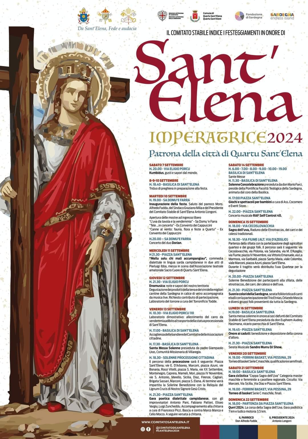 Il calendario degli eventi a corredo della celebrazione religiosa vede, sabato 7, la manifestazione 'Kumbidus - gusti e sapori dal mondo'. Martedì 10 aprono le mostre a ingresso libero 'L’uva da tavola e la vendemmia' - presso la casa museo Sa Domu ‘e Farra -, 'Tele in concerto' e 'Canne al vento: fauna, flora e feste a Quartu', nei locali dell'ex Convento dei Cappuccini. Alle 20, alla casa museo, Concerto del duo Dorian. Nella serata di mercoledì 11, in piazza Sant’Elena, commedia in lingua campidanese. Di nuovo sapori protagonisti giovedì 12: in programma 'Enomusica: note e sapori del nostro territorio'. Degustazione dei prodotti della terra e dei vini di una selezione di cantine della Sardegna con accompagnamento di musica dal vivo. La serata di venerdì 13 vede svolgersi 'Sa Cantada de Sant’Aleni', gara poetica campidanese. Sabato 14 giochi e animazione per bambini e, in serata, concerto di Raf.