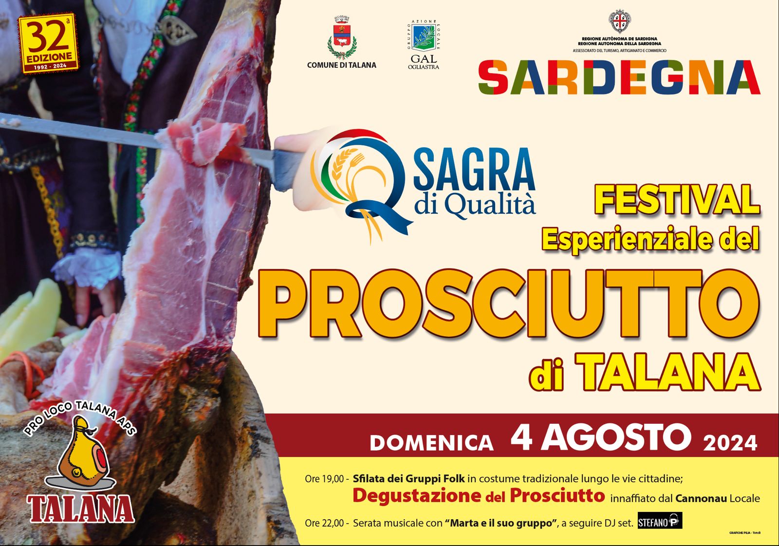 Domenica 4 agosto 2024, Talana ospita la 32esima edizione della Sagra del Prosciutto, conosciuta anche come Festival Esperienziale e insignita del marchio di Sagra di Qualità da parte dell'UNPLI (Unione Nazionale Pro Loco d'Italia).