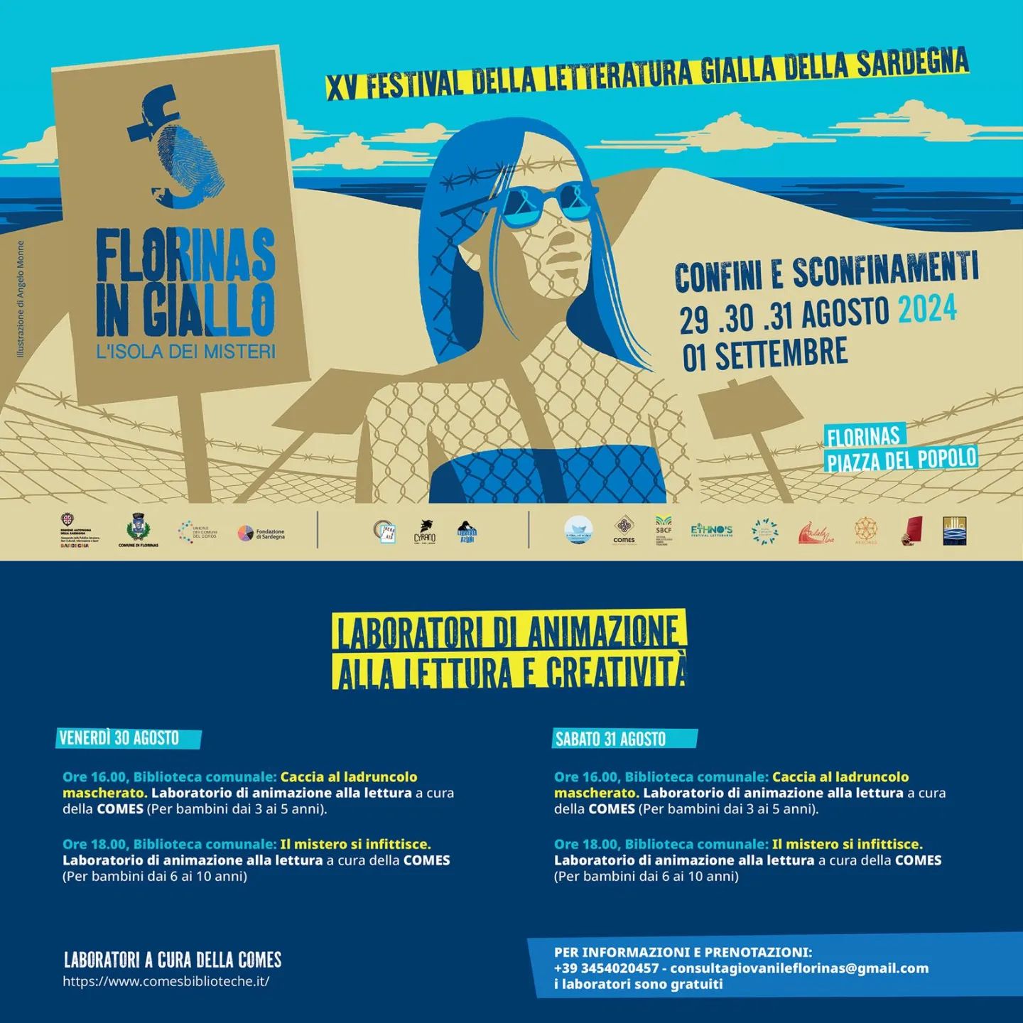 Gli appuntamenti hanno luogo tra piazza del Popolo e la biblioteca comunale. In programma, a partire da giovedì 29 alle 18.30, incontri con Brigitte Glaser, Angelo Corbo, Patrizia Rinaldi, Frederic Paulin, Gaja Cenciarelli, François Morlupi, Massimiliano Avesani, Susana Martin Gijon, Cinzia Bomoll e Emiliano Ereddia. Il cartellone prevede anche reading - tra i quali il primo, giovedì 29, curato da Neri Marcorè -, laboratori di animazione alla lettura, incontri pedagogici e spettacoli tra parole e musica. Grande novità della XV^ edizione è l'istituzione del premio letterario Florinas in Giallo: la proclamazione del vincitore è prevista per domenica 1 settembre presso il parco comunale.
