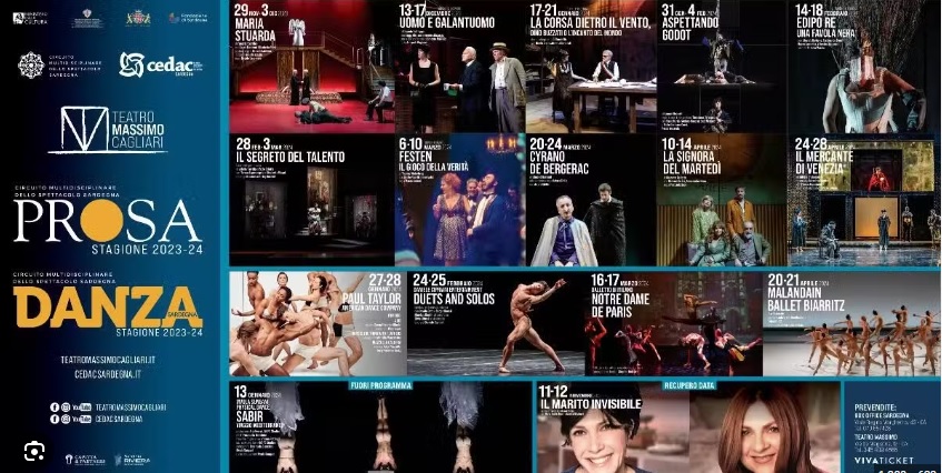 Il programma 2023 - 2024 de La Grande Prosa e Danza al Teatro Massimo di Cagliari organizzata dal CeDAC / Circuito Multidisciplinare dello Spettacolo dal Vivo in Sardegna con il patrocinio e il sostegno del MiC/ Ministero della Cultura, della Regione Sardegna e del Comune di Cagliari e con il contributo della Fondazione di Sardegna prevede, fino ad aprile, dieci rappresentazioni di prosa e quattro di danza.