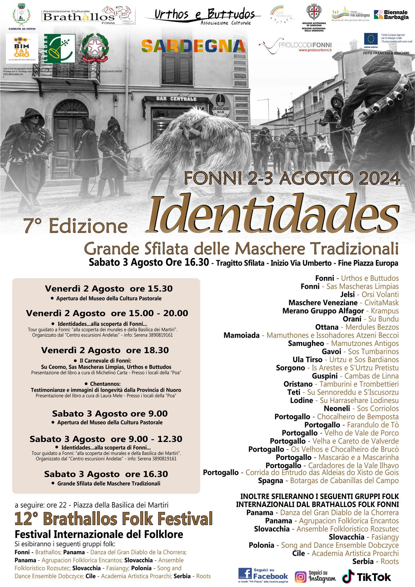 Il corteo si svolge sabato 3 a partire dalle 16.30, con partenza da via Umberto e arrivo in piazza Europa. Partecipano maschere provenienti da diversi comuni della Sardegna - tra cui Urthos e Buttudos di Fonni, Su Bundu di Orani, Medules Bezzos di Ottana, Mamuthones e Issohadores di Mamoiada, Sos Corriolos di Neoneli, oltre a Sos Tamburinos di Gavoi e ai Tamburini e Trombettieri della Sartiglia di Oristano. Non mancano ospiti internazionali, quest'anno provenienti da Spagna e Portogallo. A seguire, la festa continua con la 12esima edizione del Brathallos Folk Festival, in piazza della Basilica dei Martiri. Oltre al gruppo folk locale, sfilano gruppi internazionali da Panama, Slovacchia, Polonia, Cile e Serbia.