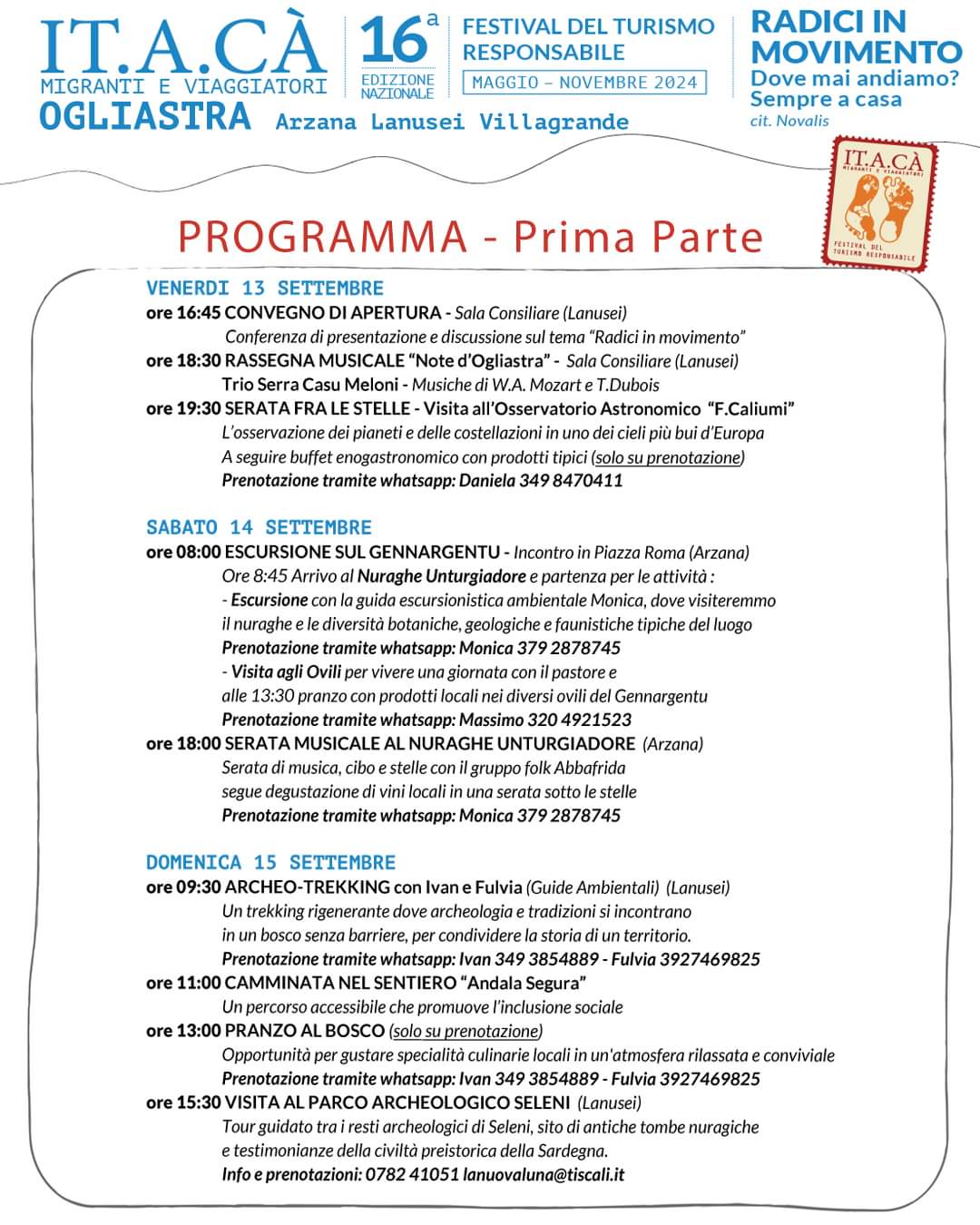 “Radici in movimento" sarà il filo conduttore che legherà tutti gli appuntamenti della edizione 2024 della tappa Ogliastra di IT.A.CÀ Migranti e Viaggiatori - Festival del Turismo Responsabile che giunge alla XVI edizione e che approderà nuovamente in Ogliastra, nei paesi di Lanusei, Villagrande Strisaili, Arzana, dal 13 al 22 settembre 2024, per due weekend, dal venerdì alla domenica.