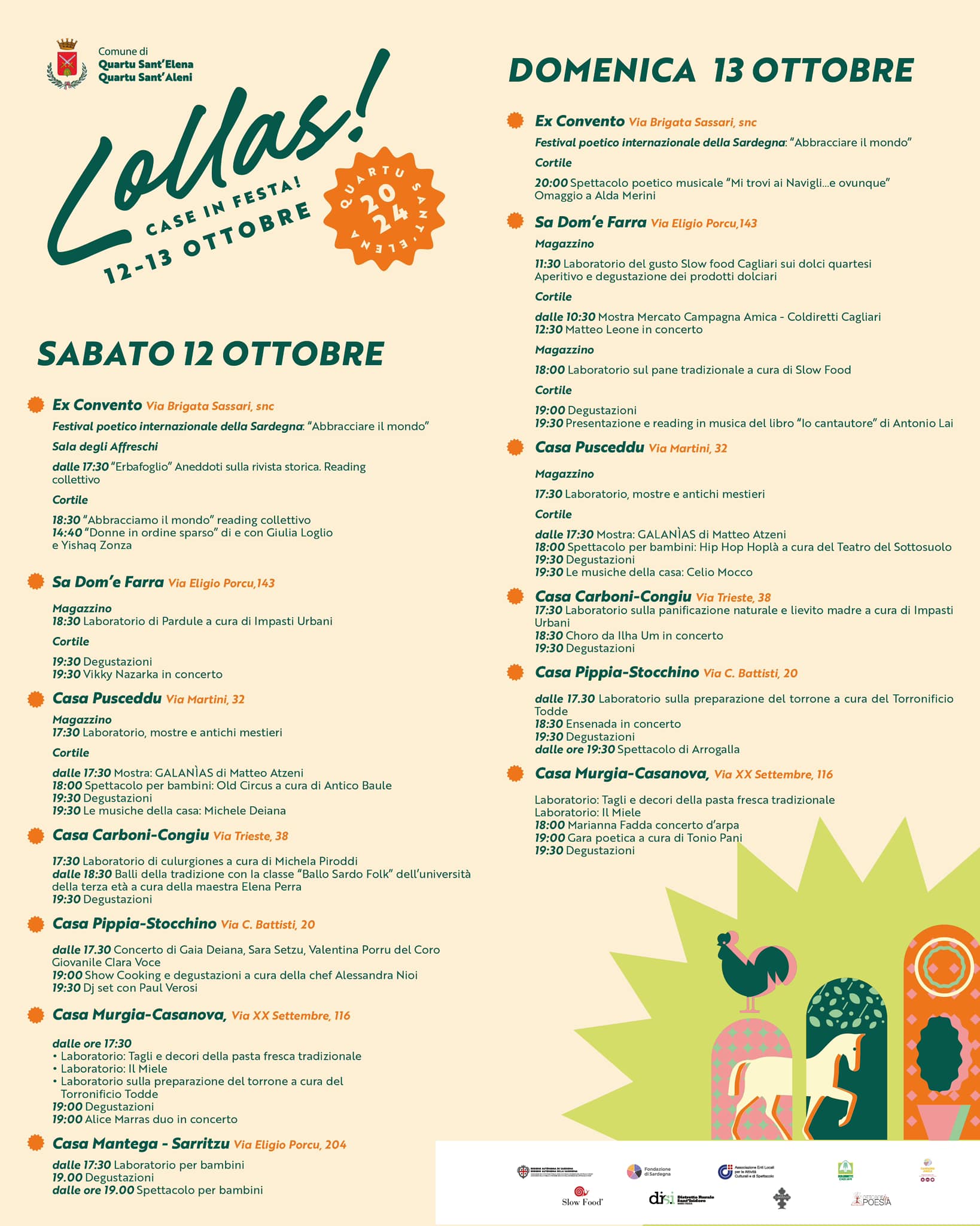 Sabato 12 e domenica 13 ottobre 2024 le antiche case campidanesi di Quartu Sant'Elena aprono le loro porte, trasformandosi in suggestivi spazi per laboratori enogastronomici, degustazioni, reading e spettacoli, con la manifestazione Lollas - Case in festa.