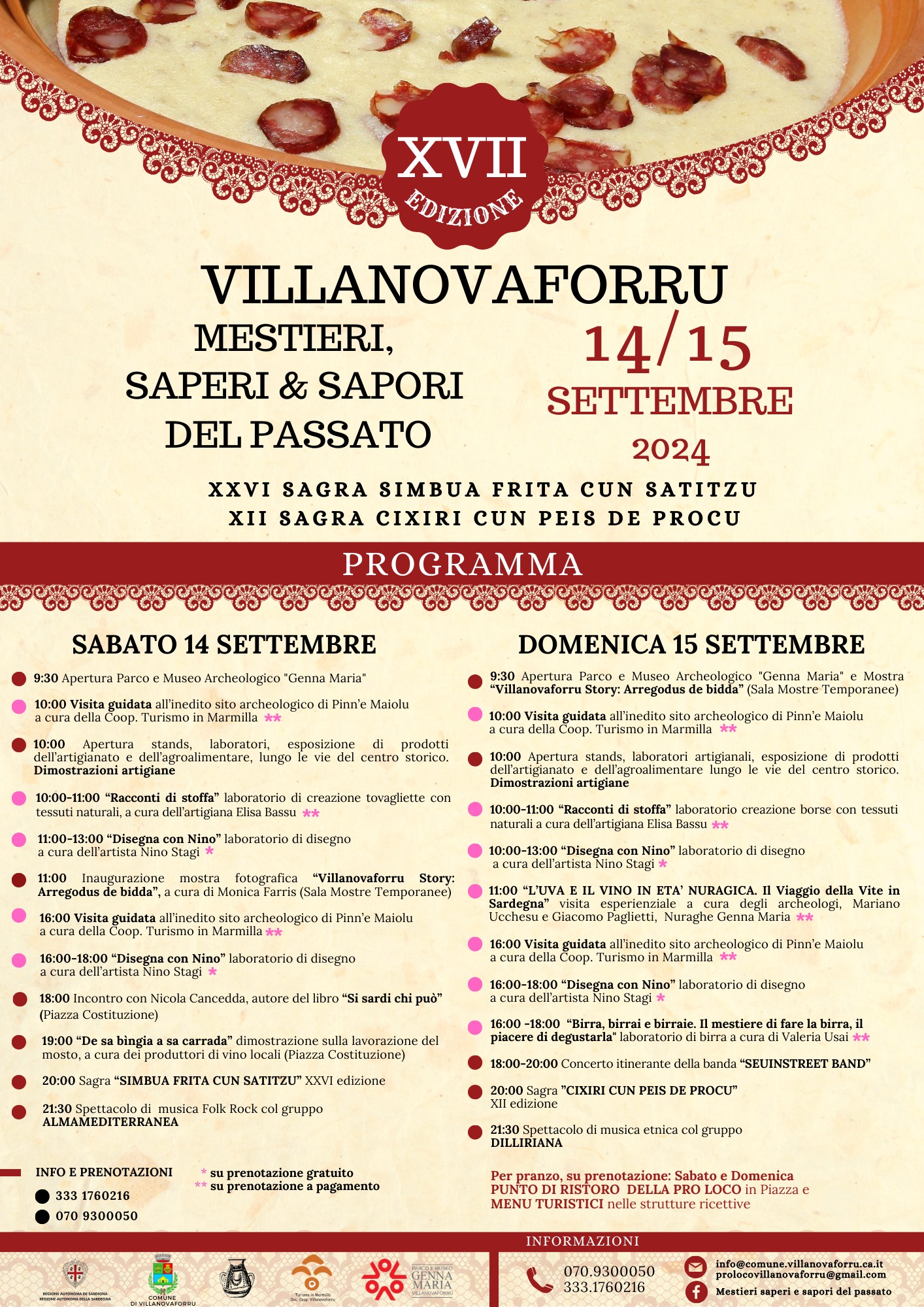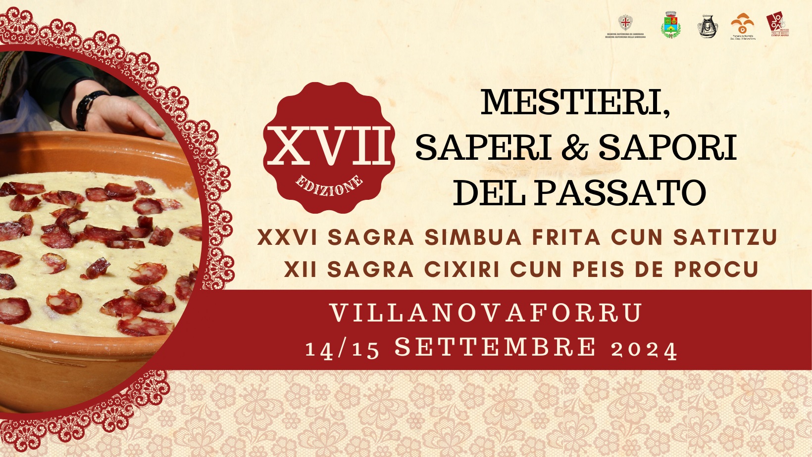 Alla manifestazione si associano anche due sagre: sabato alle 20, la 26esima edizione de sa Sagra de sa Simbua frita cun Satitzu, mentre domenica 15 - alla stessa ora - è la volta della dodicesima Sagra de su Cixiri cun peis de Procu.