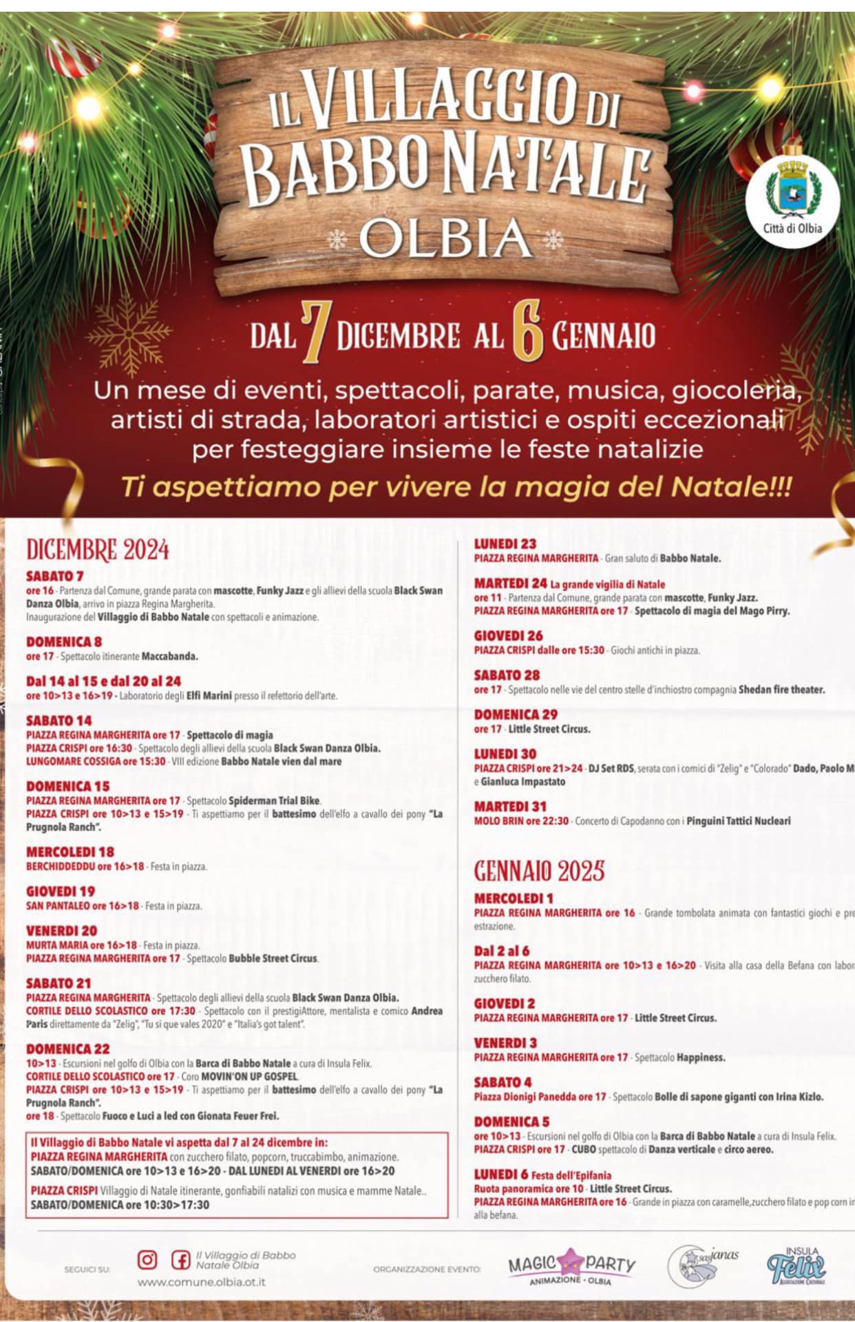 'Trascorri il Natale ad Olbia!' è il nome del programma di spettacoli ed eventi predisposto dal comune della cittadina gallurese per festeggiare il Natale 2024. Il via ufficiale è previsto per sabato 7 dicembre, con con l’inaugurazione del villaggio di Babbo Natale in piazza Regina Margherita. Parate, musica e balli accompagnano l'inizio della manifestazione. Sabato 14 in piazza Crispi apre il villaggio di Natale itinerante, con gonfiabili natalizi, la pista di pattinaggio sul ghiaccio e tanta musica. Nel pomeriggio, sul lungomare Cossiga, la nuova edizione della parata in acqua 'Babbo Natale vien dal mare'. Domenica 15 in piazza Crispi torna il Battesimo dell’elfo a cavallo dei pony. Venerdì 20, 'Bubble street circus' in piazza Regina Margherita, mentre domenica 22 è il turno delle sonorità Gospel con il coro Movin’on up gospel. Lunedì 23, gran saluto di Babbo Natale in piazza Regina Margherita, in compagnia di mascotte natalizie a rotazione e baby dance. Il giorno della vigilia è prevista la grande parata: partenza dal Comune alle 11. Ancora appuntamenti da Santo Stefano in poi: il 26 giochi antichi in piazza Crispi, il 28 spettacolo nelle vie del centro, fino agli eventi del Capodanno del 30 e 31, con gli spettacoli dei comici di Zelig e l'atteso concerto del 31 che quest'anno vede protagonisti Pinguini Tattici Nucleari e Boomdabash. Animazione, tombolate, spettacoli e laboratori completano il programma fino all'Epifania.