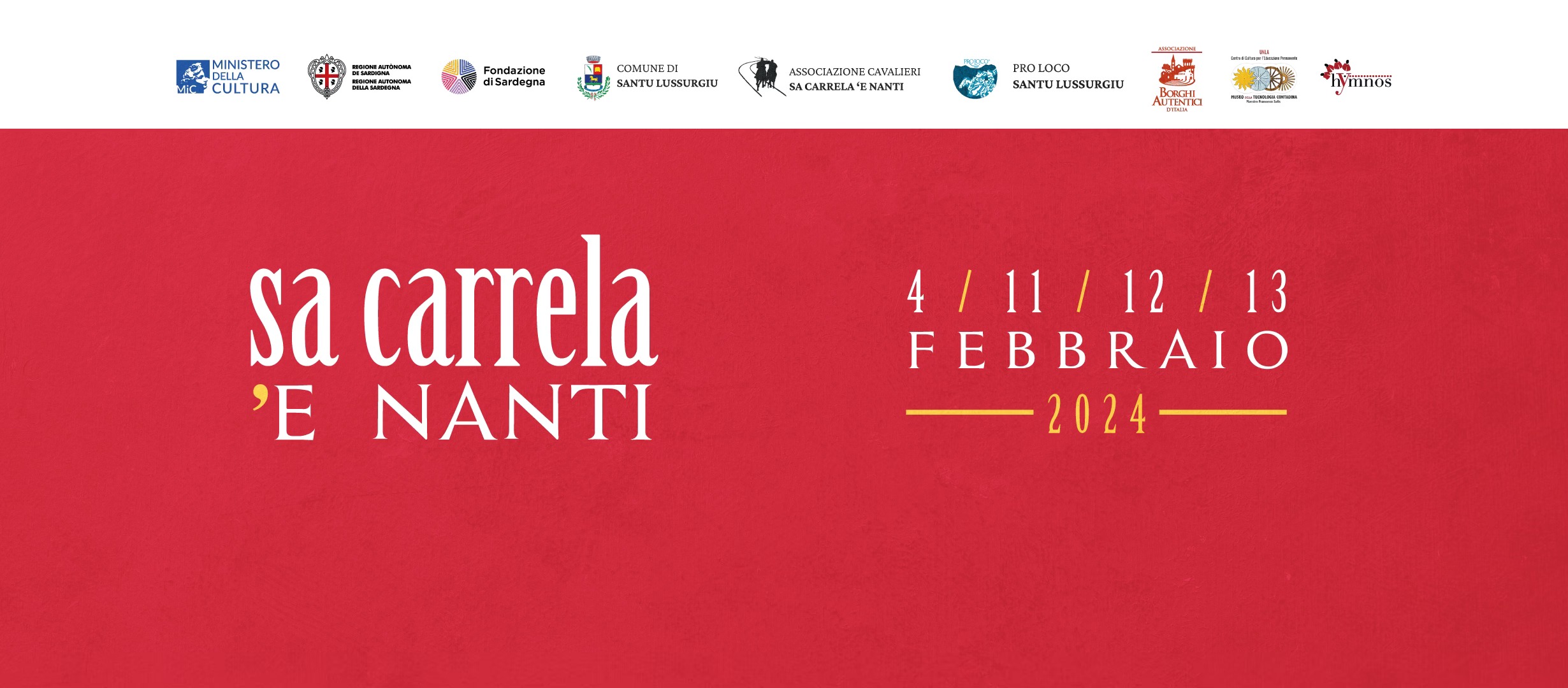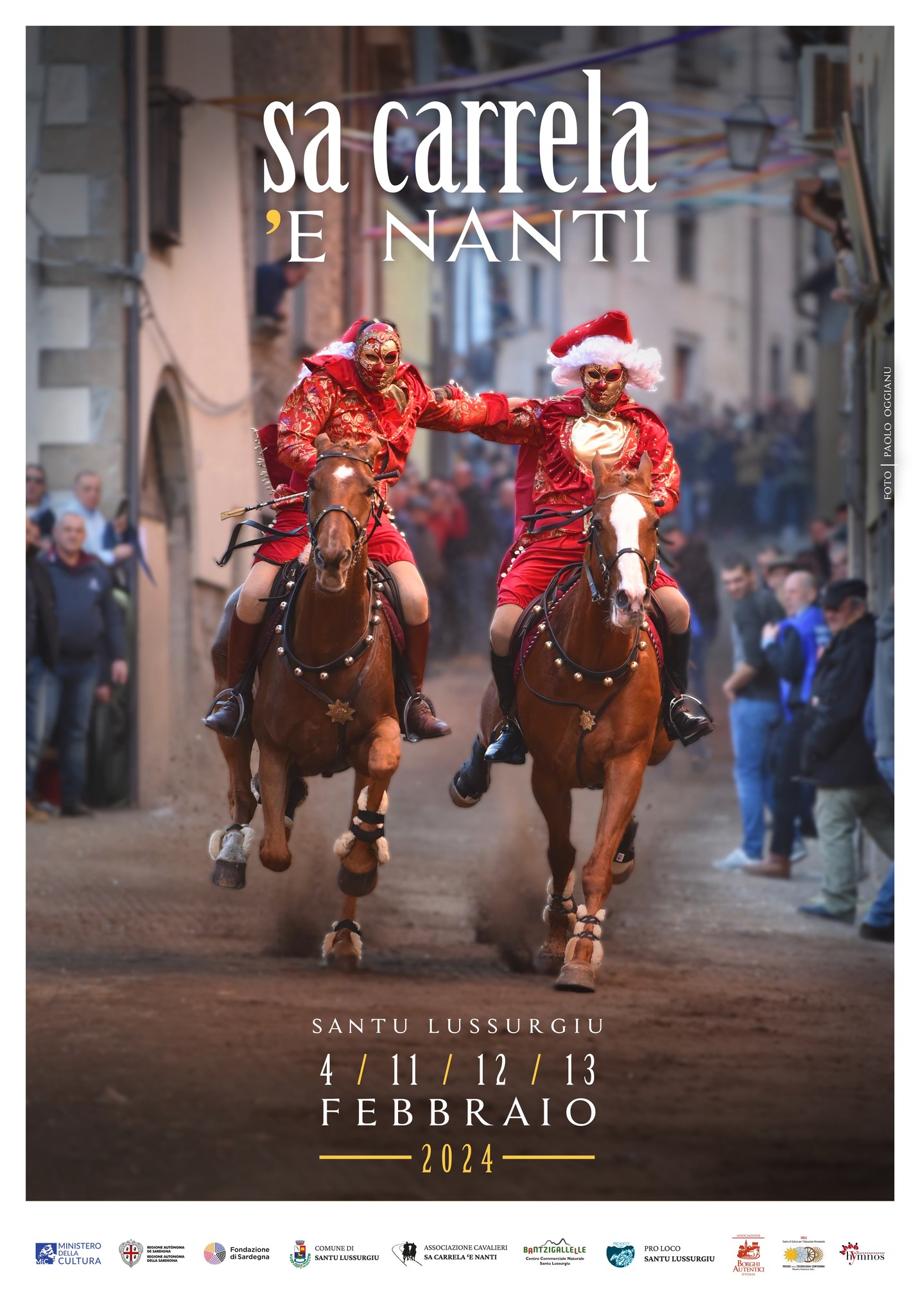 Da domenica 11 a martedì 13 febbraio 2024, Santu Lussurgiu ospita una delle corse a cavallo più spericolate e colorate della Sardegna: Sa Carrela 'e nanti, evento-simbolo del carnevale lussurgese, che ha come protagonisti i cavalieri, i cavalli e il pubblico. Anche la folla è parte integrante dell’evento creando un particolare effetto: la folta massa si apre un attimo prima dell’arrivo dei cavalli in corsa per richiudersi subito dopo il loro passaggio. Sa Carrela ‘e Nanti (l’attuale Via Roma) è una strada sterrata lunga circa 350 metri in discesa. I cavalieri devono indossare, secondo la tradizione, una maschera o avere il volto dipinto.