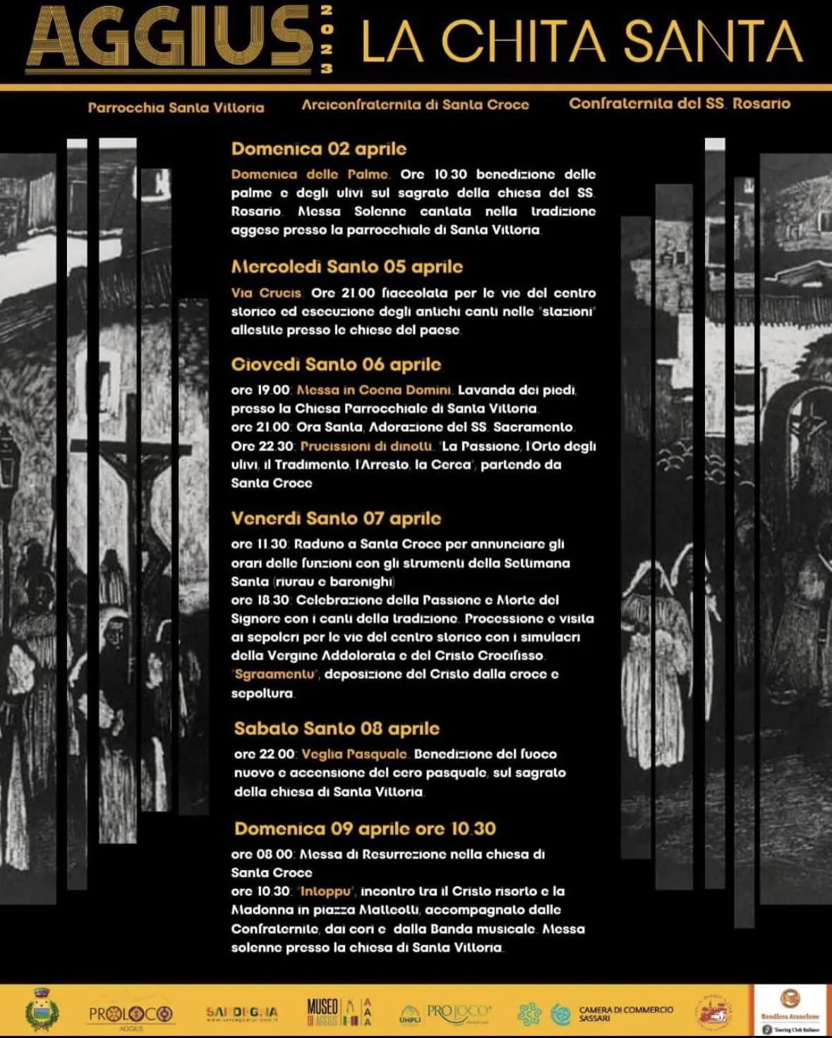 Dal 2 al 9 aprile, Aggius si immerge negli antichi e suggestivi riti della Settimana Santa. L'insieme delle cerimonie e delle processioni che compongono sa Chita Santa nel borgo gallurese è considerato tra i più particolari dell'isola, soprattutto grazie alla Tasgja, il tipico canto polifonico che accompagna i momenti più significativi delle celebrazioni.