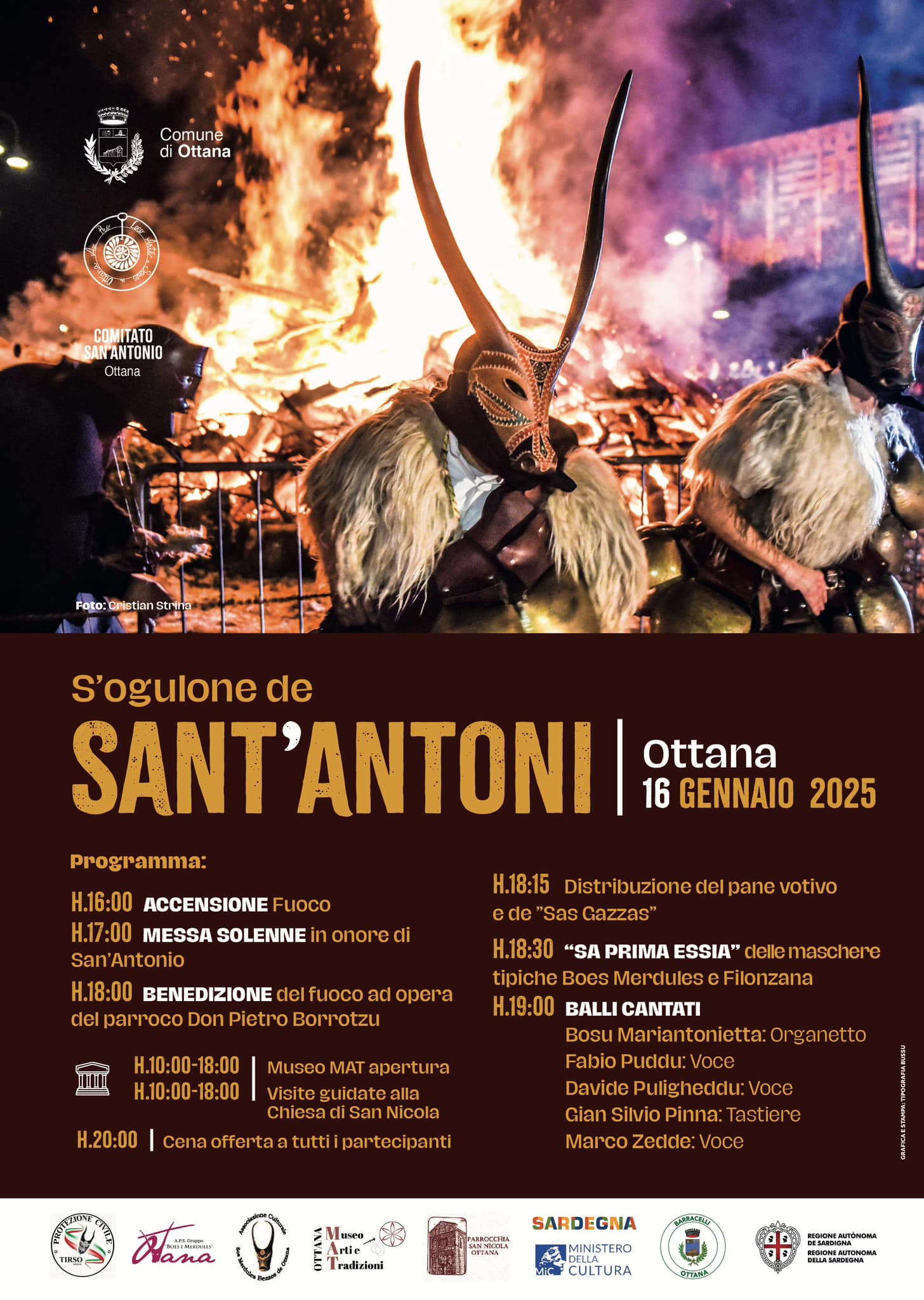 Sa prima essia - ovvero la prima uscita 'ufficiale' - delle maschere tipiche di Ottana Boes e Merdules e Filonzana avviene come da tradizione in occasione dell'accensione del falò in onore di Sant'Antonio abate: l'evento si ripete giovedì 16 gennaio, per l'edizione 2025 de s'Ogulone de Sant'Antoni.