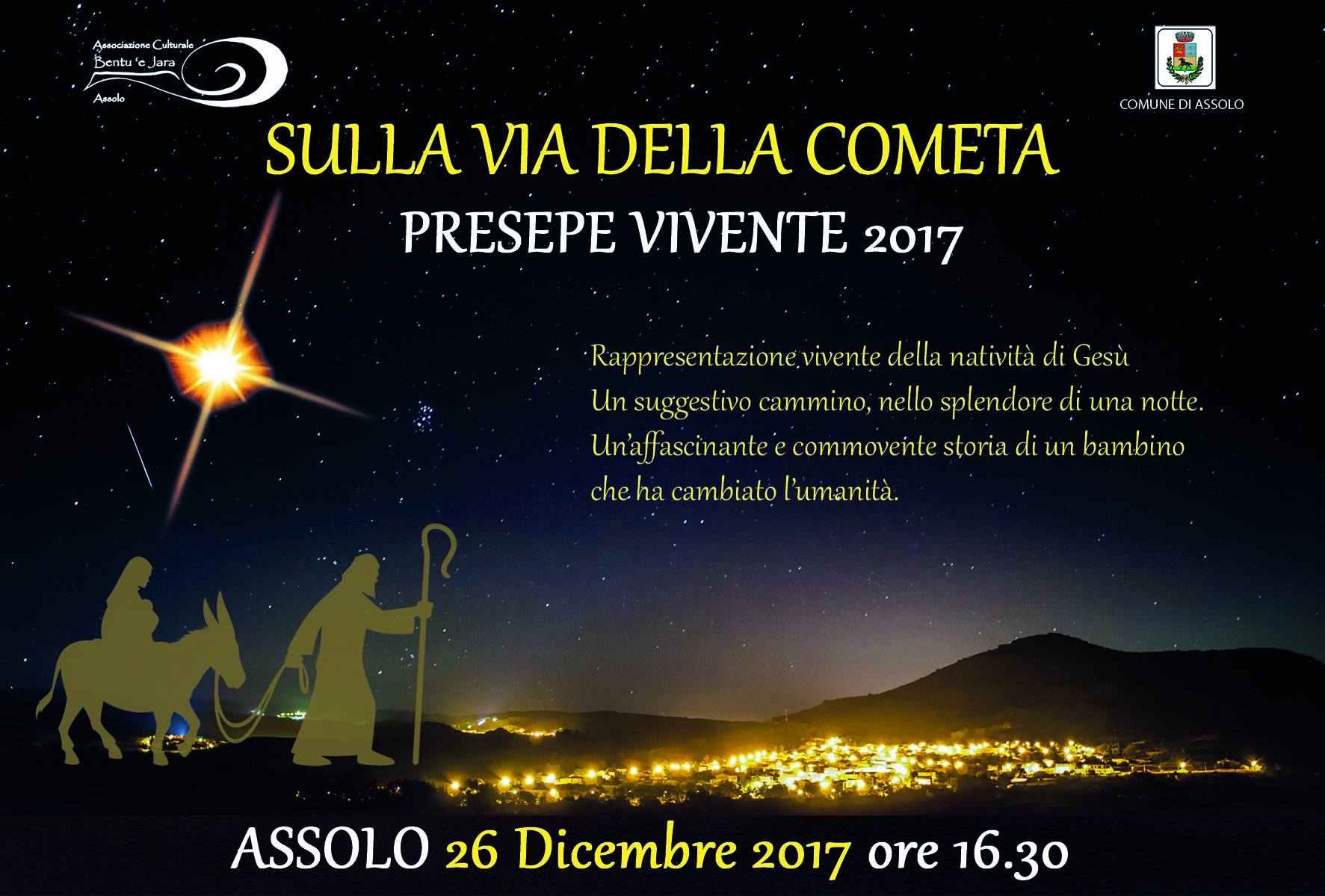 "Sulla Via della Cometa". E' questo il nome dell'evento in programma ad Assolo, un piccolo e suggestivo borgo ai piedi dell'Altopiano della Giara, organizzato dall'associazione culturale locale Bentu 'e Jara, in programma martedì 26 dicembre 2017, giorno di Santo Stefano, a partire dalle 16.30.