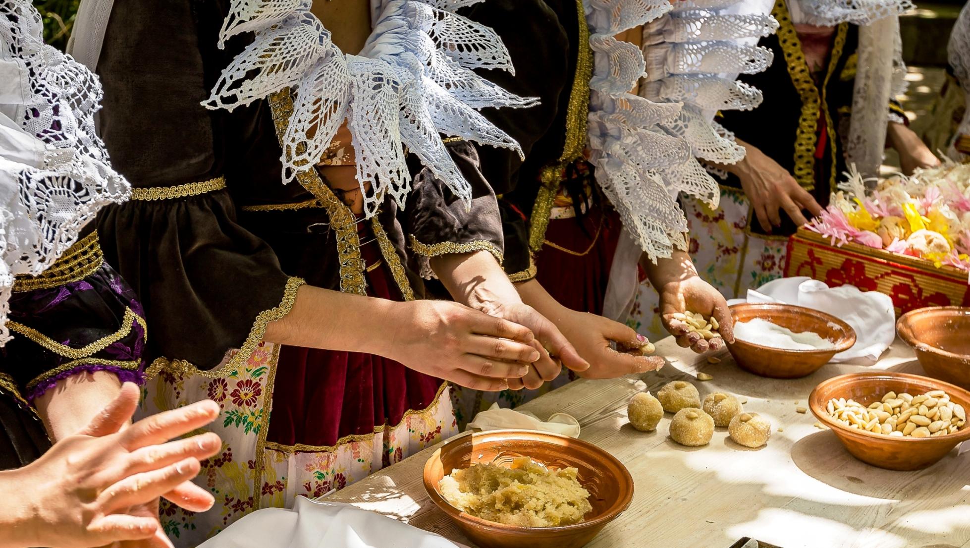 Da sempre simbolo di ricorrenze e celebrazioni, i pani e i dolci tipici che si preparano in Sardegna per le festività natalizie sono gioielli ricchi di gusto, sempre diversi, da paese a paese. Nei forni del Logudoro si preparano su bacchiddu ‘e Deu, un pane a forma di bastone che ricorda il pastorale dei vescovi, e sa pertusitta, una focaccia decorata con immagini di pastori e pecore in rilievo. Il gusto de sa tunda, pane tondo dell’Oristanese, è arricchito da noci e uvetta. In Ogliastra era diffusa un’antica usanza che ogni tanto ritorna, regalare pani a forma di cuore, di stella o di neonato. Originario del Nuorese, oggi sfornato in tutta l’Isola, è su pani cun gherda, cioè con i ciccioli di lardo di maiale. C’è un dolce un tempo solo natalizio ma talmente buono che da decenni si prepara tutto l’anno, il torrone di Tonara, senza zucchero, solo a base di miele squagliato a fuoco lento in un paiolo in rame e rimestato per ore, con aggiunta di mandorle, nocciole o noci.