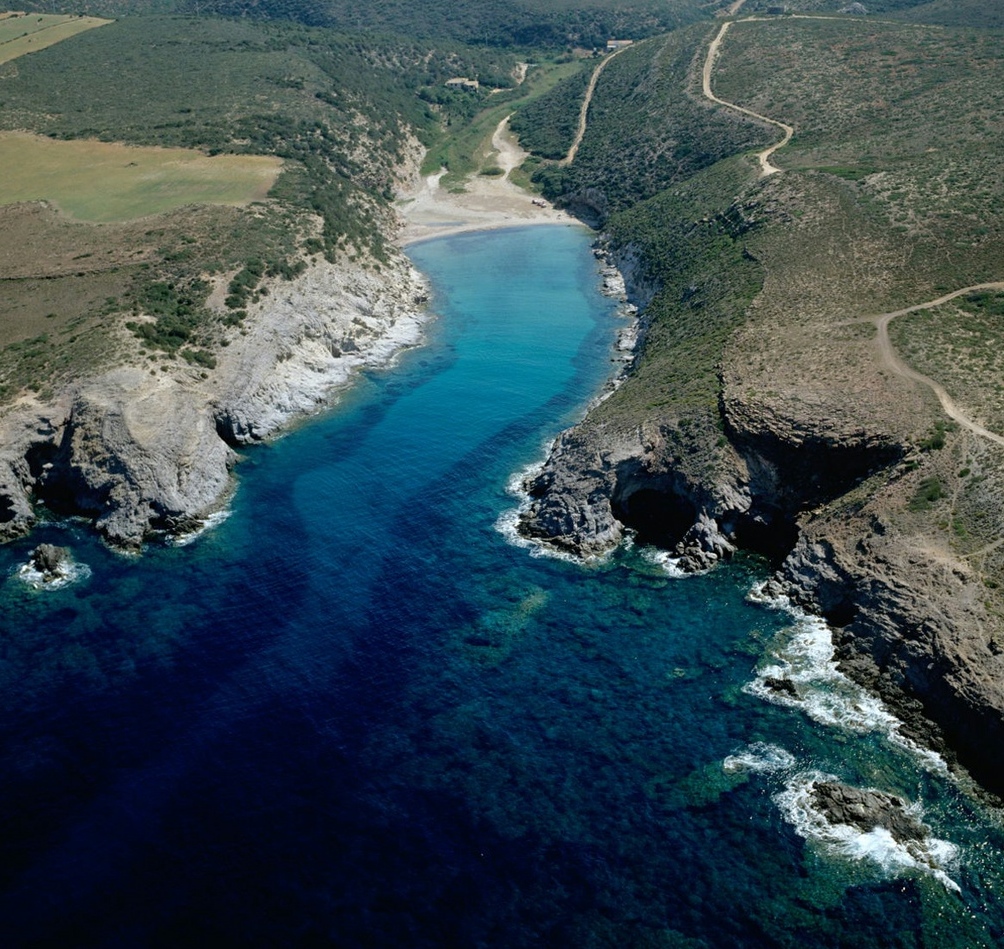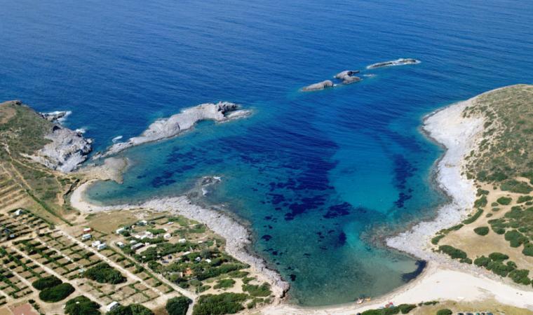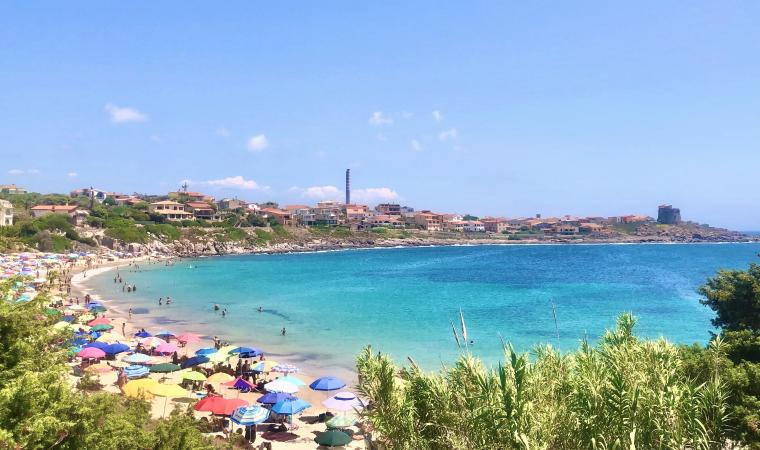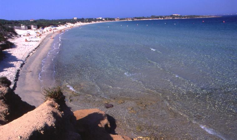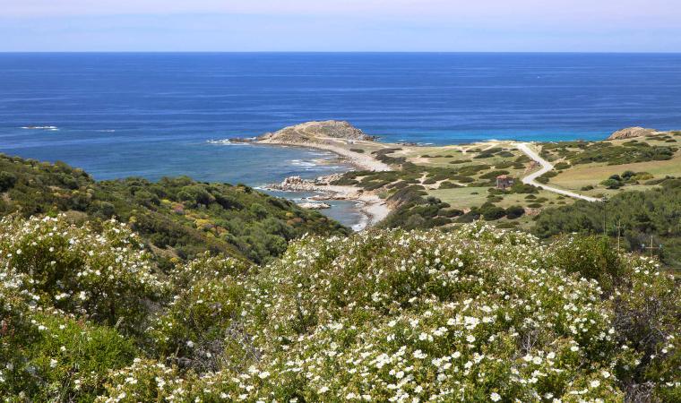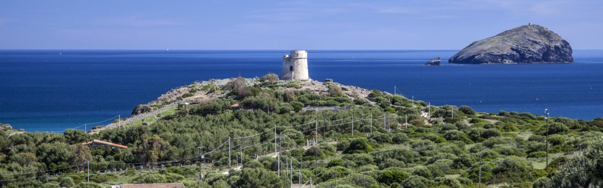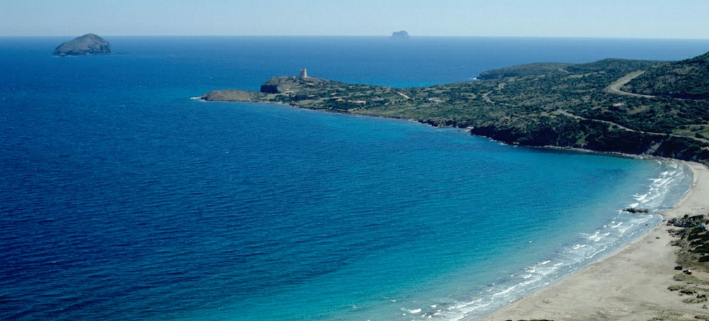 Le coste, alte e frastagliate a sud con falesie di trachite scura, più sabbiose a nord, hanno fondali ideali per immersioni. Portixeddu è la spiaggetta più vicina alla città, contornata da rocce chiare e verde di rarissimi ginepri fenici, secolari palme nane ed essenze mediterranee. È di ciottoli, come la più grande Turri. Mentre Maladroxa è una distesa di sabbia grigia e sottile: dal suo fondale emergono acque termali, sfruttate già dai romani. Superati il promontorio Serra de is tres Portus e lo stagno di santa Caterina, dove nidificano cavaliere d’Italia e fenicottero, arriverai all’ampia e sinuosa spiaggia di Coqquaddus. Sulla scogliera di is Praneddas (o arco ‘dei Baci’) starai su una terrazza, 200 metri sopra il mare. A largo degli scogli piatti e imbiancati di salsedine di Cala Sapone, già i fenici pescavano i tonni. Oggi osserverai i ruderi dell’ottocentesca tonnara. Vicine altre suggestive baie: le cale Grotta e della Signora. Capo Sperone è l’estrema punta a sud: mare azzurro cangiante e distese di peonie rosa. Sullo sfondo gli isolotti della Vacca e del Toro, aree protette dove vola il falco della regina, teatro della battaglia navale tra flotte romana e sardo-punica (258 a.C.). Più avanti la solitaria spiaggia s’Ega de is Tirias, da cui visitare in mountain bike o barca il selvaggio litorale fino a Portu de su Trigu.