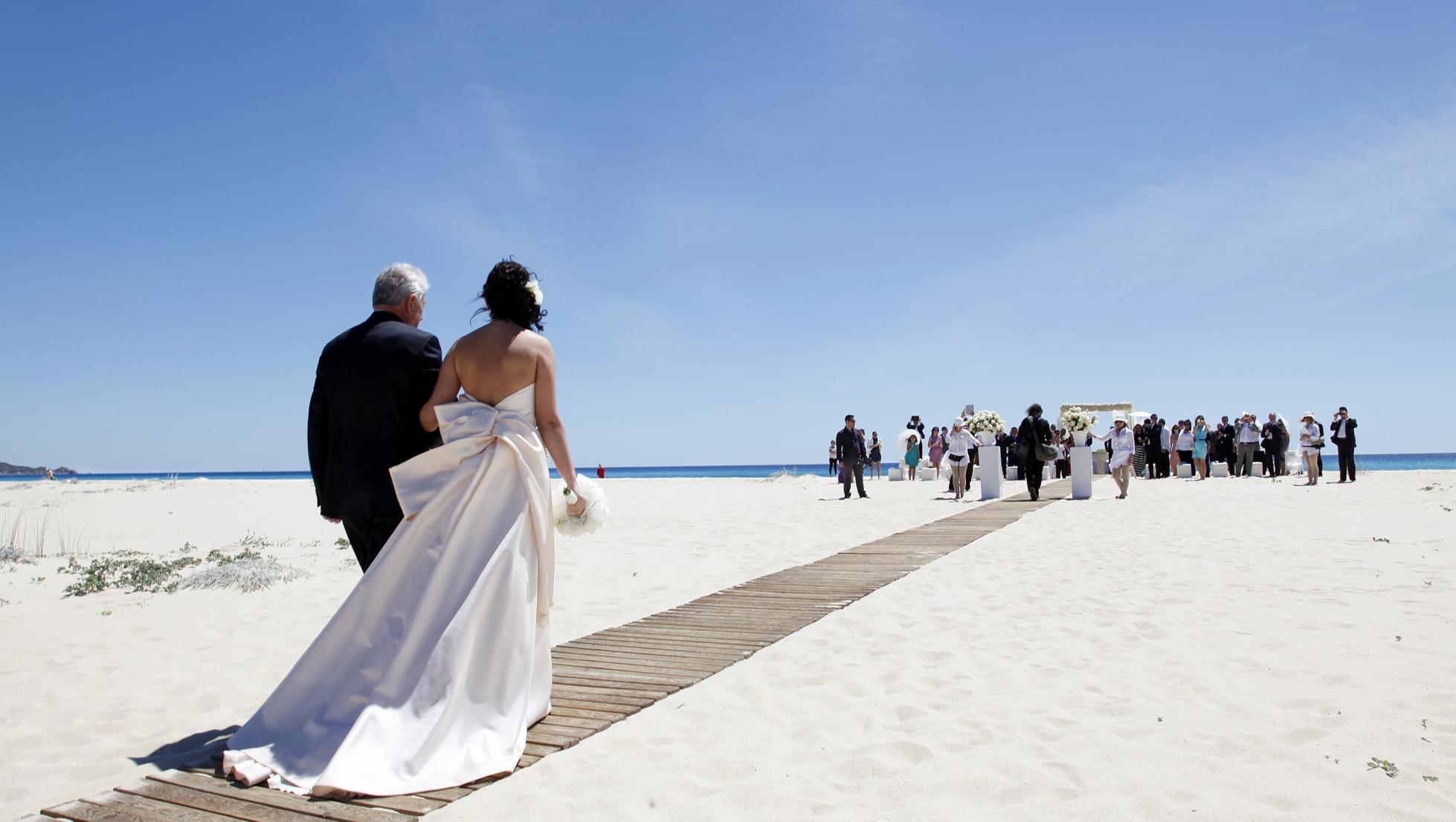 Poi ci sono le spiagge del sud Sardegna. Il clima mite del Mediterraneo, la calda brezza del vento, il profumo di salmastro e una vista paradisiaca accompagnano le celebrazioni all’aperto, non solo d’estate. Lungo tutta la costa meridionale ci si sposa davanti al mare, nelle spagge di sabbia morbida e bianchissima, da Cala Sinzias di Castiadas a Santa Margherita di Pula. A Quartu Sant’Elena la scelta va dalla sala Affreschi dell’ex convento dei cappuccini sino al Poetto. A pochi metri dalla battigia, si può scegliere tra una cerimonia diurna, con il sole che fa brillare il mare blu topazio, e una cerimonia serale, con gli sposi che si giurano amore eterno con lo sfondo di un tramonto infuocato che si spegne dietro la Sella del Diavolo. Oppure c’è la scoperta di luoghi custodi di antichi e suggestivi ricordi, come il faro di Capo Spartivento a Teulada. Risalendo lungo la costa sud-occidentale altri luoghi per nozze ‘da mille e una notte’ sono i siti minerari dismessi di Nebida e Masua (nel territorio di Iglesias), con vista sul faraglione di Pan di Zucchero. Mentre nel ‘cuore’ del Sulcis si candida ad accogliere le coppie di promessi sposi lo scenario dell’ex cattedrale di santa Maria di Monserrato di Tratalias, gioiello dell'architettura romanica.