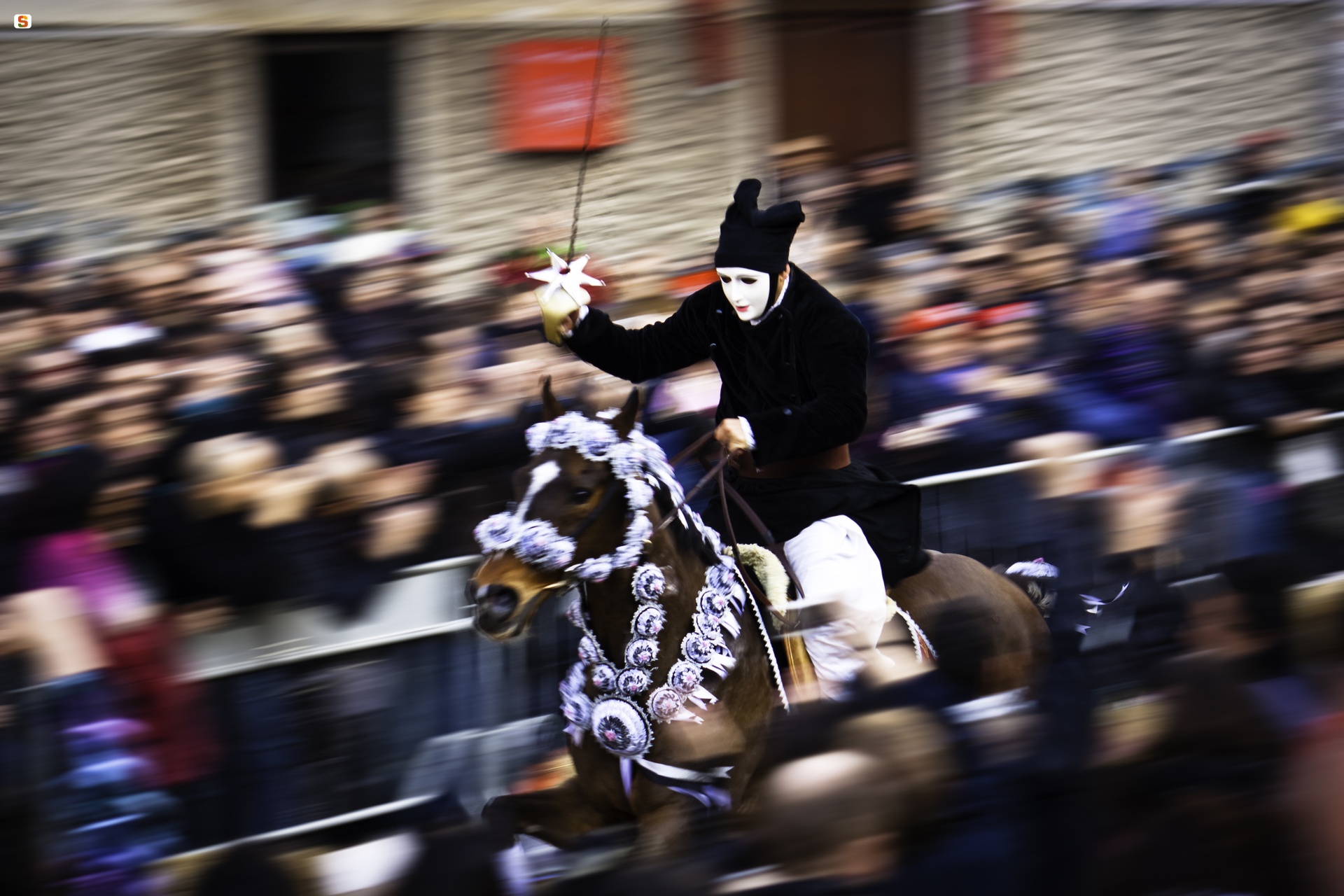 Su componidori non può toccar terra, dal tavolo della vestizione viene ‘traslato’ sul cavallo. Il signore della giostra incrocia tre volte la spada col suo secondo e apre la serie di discese sfrenate per infilzare la stella. È poi la volta di tutti gli altri cavalieri, ai quali lo stesso componidori concede l’onore della spada. Solo a lui e ai suoi aiutanti è riservata una seconda discesa con su stoccu, una lancia di legno. I momenti della corsa sono scanditi da tamburi e trombe. Di fronte alla cattedrale di Santa Maria assunta il capocorsa si esibisce in sa remada, massima prova di coraggio: si lancia riverso all’indietro sulla groppa del destriero e benedice la folla in segno di buon auspicio con sa pippia de maiu. Poi il nobile corteo si trasferisce in via Mazzini dove gruppi di tre cavalieri (pariglie) compongono piramidi e torri umane con i corpi in bilico sui destrieri. Terminate le acrobatiche esibizioni, ecco la svestizione de su componidori, che si toglie la maschera ieratica rivelando il viso di chi ha impersonato la divinità.